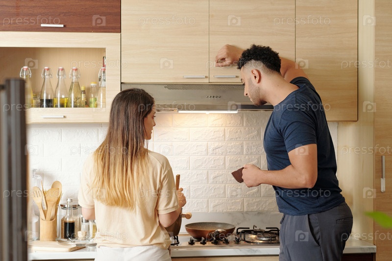 Любопытный мужчина смотрит на кулинарную жену