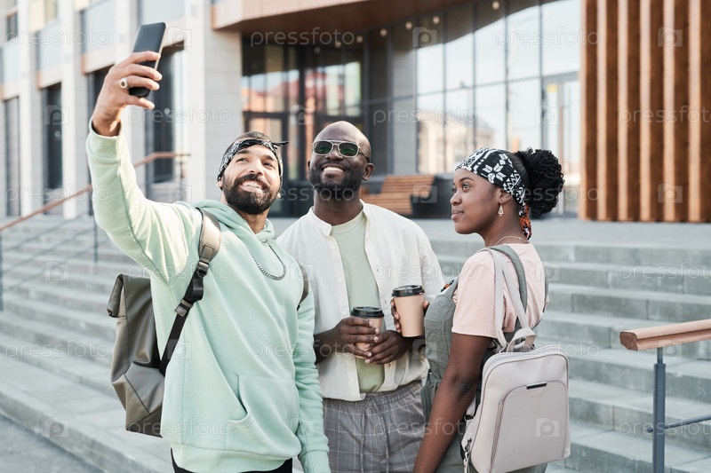 Друзья позируют с кофе для селфи