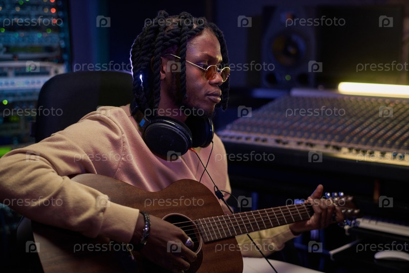 Африканский музыкант играет на гитаре в студии