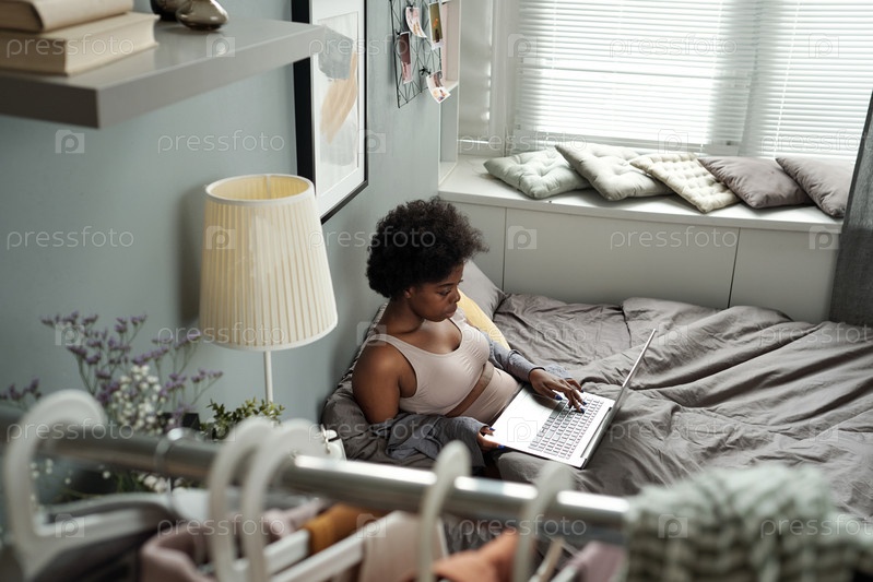 Африканская женщина в нижнем белье ведет сетевую связь с ноутбуком в постели