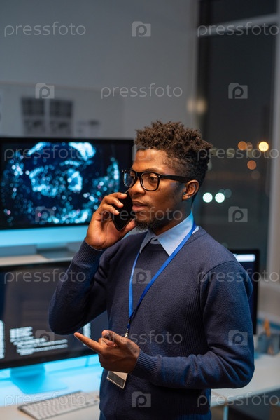 Молодой хорошо одетый программист, общающийся на смартфоне