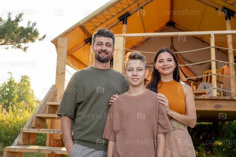 Счастливые родители и их сын-подросток стоят возле дома для глампинга
