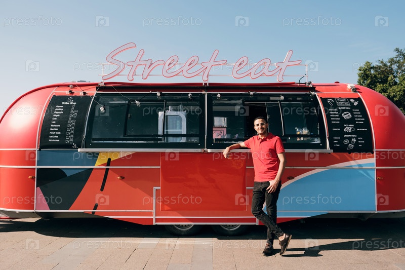 Счастливый молодой служащий в униформе стоит у грузовика уличного питания