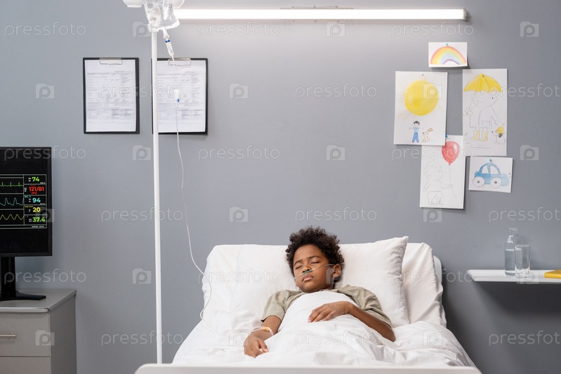 Маленький мальчик лежит под внутривенной капелькой в больнице