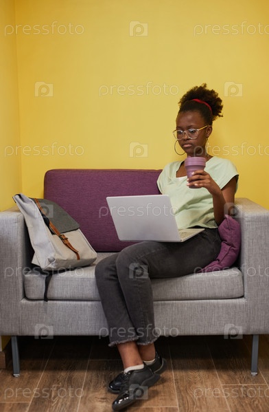 Молодая афроамериканская женщина, использующая ноутбук в колледже