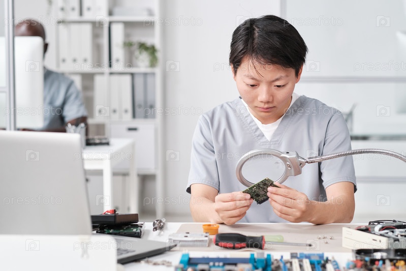 Молодая китайская женщина в форме смотрит на микрочип на борту