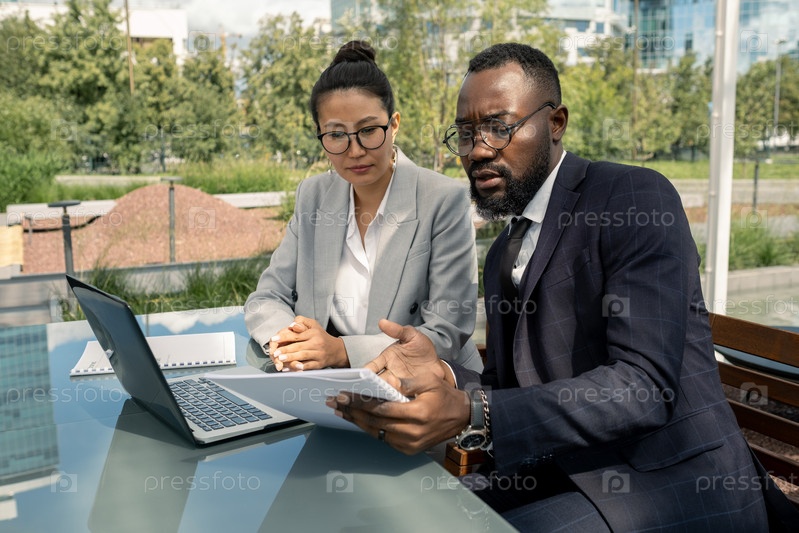 Африканский бизнесмен показывает бумагу своей азиатской партнерше