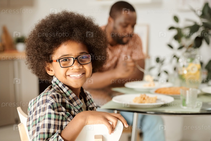 Милый мальчик в очках смотрит на тебя, когда его отец ест