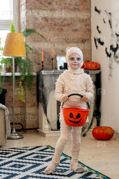 Маленькая мумия держит тыквенное ведро для сладостей
