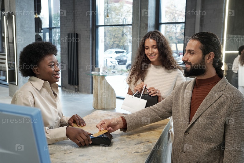 Счастливая молодая продавщица, обслуживающая мужского клиента