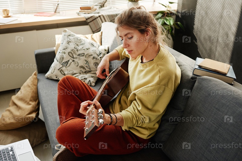 Женщина играет на гитаре в комнате