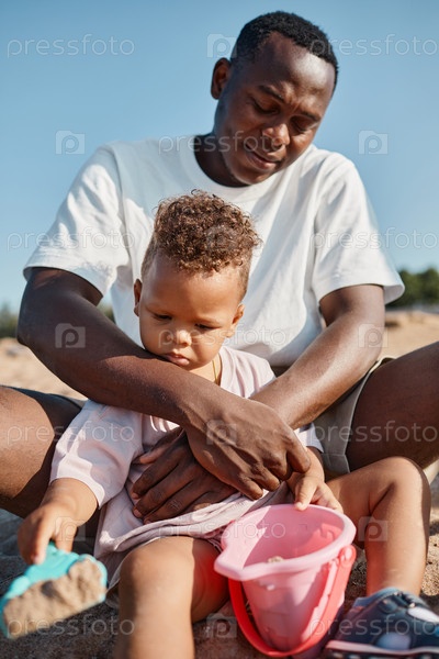 Афроамериканский отец играет с сыном на пляже