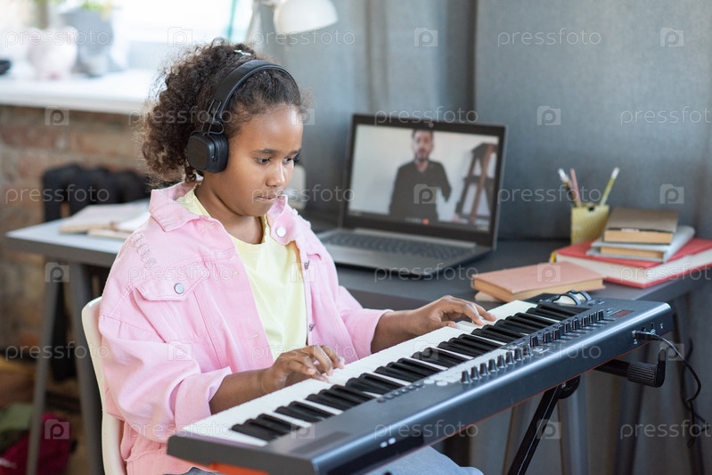 Красивая школьница в наушниках играет на клавиатуре пианино дома
