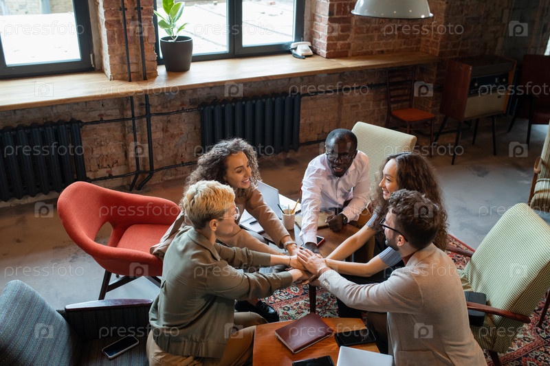 Несколько многорасовых коллег держатся друг на друге за руки