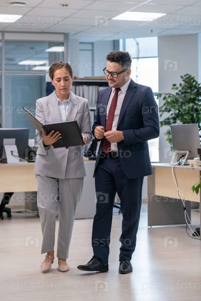 Уверенный в себе бизнесмен и его секретарь обсуждают документы