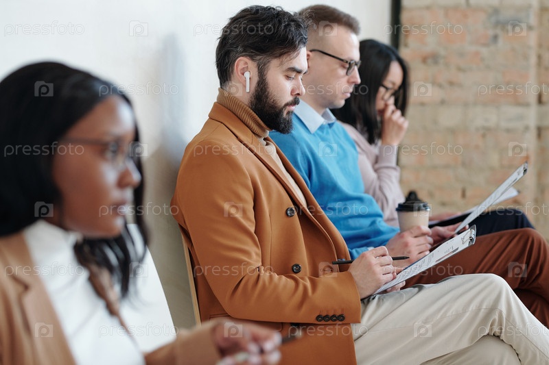 Группа серьезных молодых людей, сидящих против стены