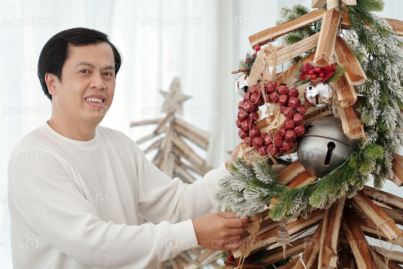 Человек, украшающий рождественскую елку