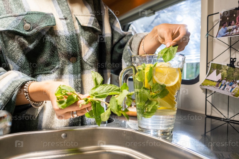 Молодая самка кладет свежие листья мяты в кружку с лимонадом