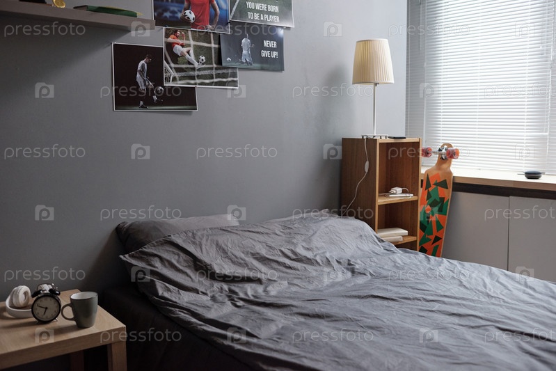 Двойная кровать у стены с плакатами футболистов