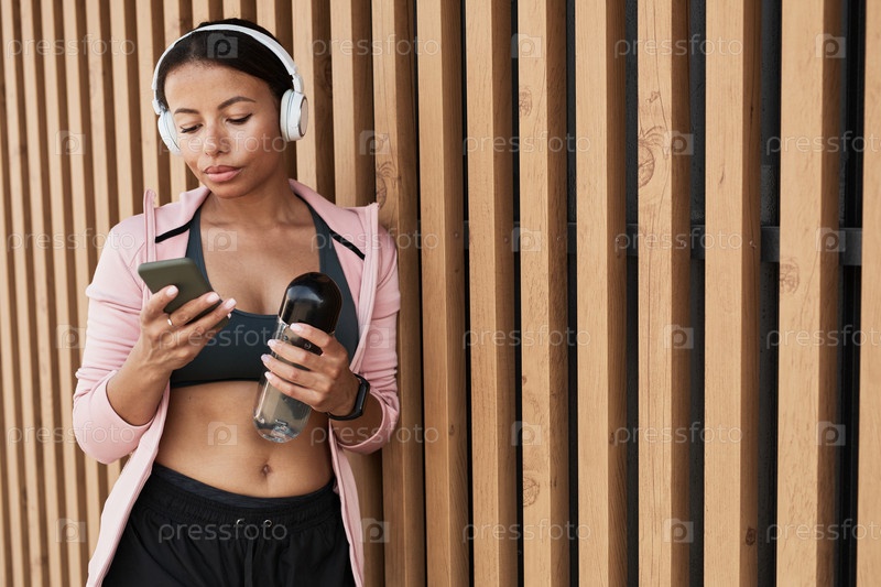 Женщина смотрит тренировку по телефону