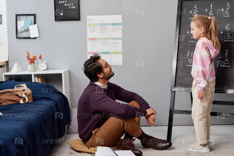 Учитель из Ближнего Востока сидит на полу и смотрит на доску, слушая ответы учеников во время урока