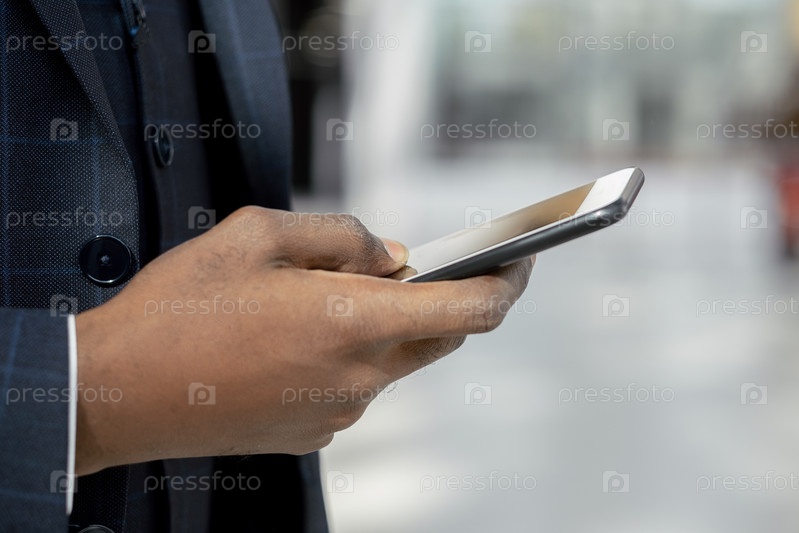 Рука молодого африканского бизнесмена, прокручивающая мобильный телефон