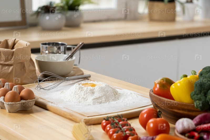 Куча просеянной муки с сырым яйцом наверху и другими ингредиентами