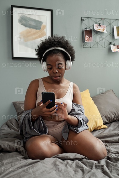 Спокойная женщина в наушниках выбирает музыку в плейлисте