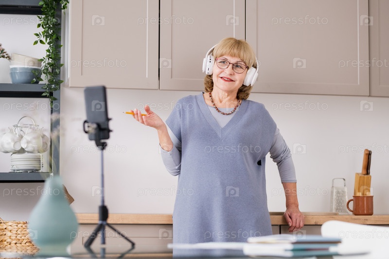 Счастливая зрелая студентка в наушниках, разговаривающая перед камерой смартфона