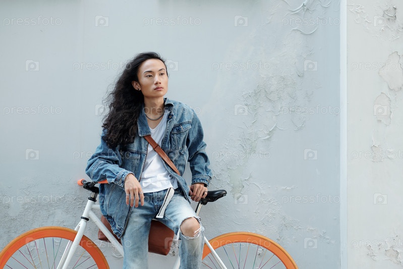 Привлекательный мужчина, опирающийся на велосипед