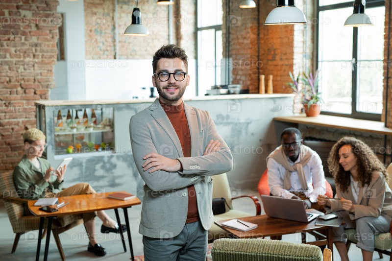 Молодой улыбающийся бизнесмен стоит перед коллегами по работе