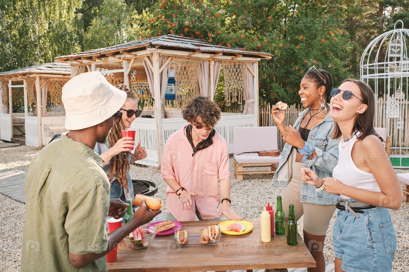 Счастливые молодые друзья развлекаются за столом со закусками