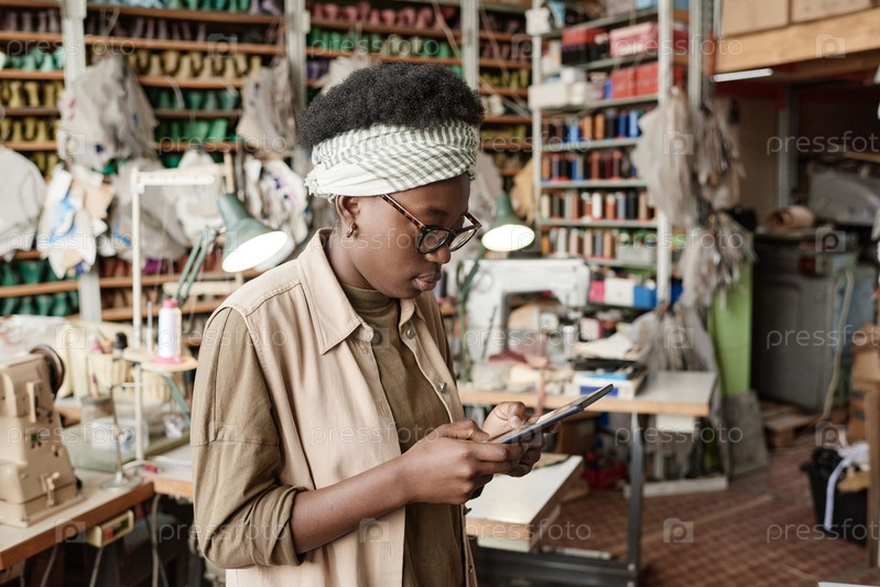 Одевательница, использующая планшетный компьютер на работе