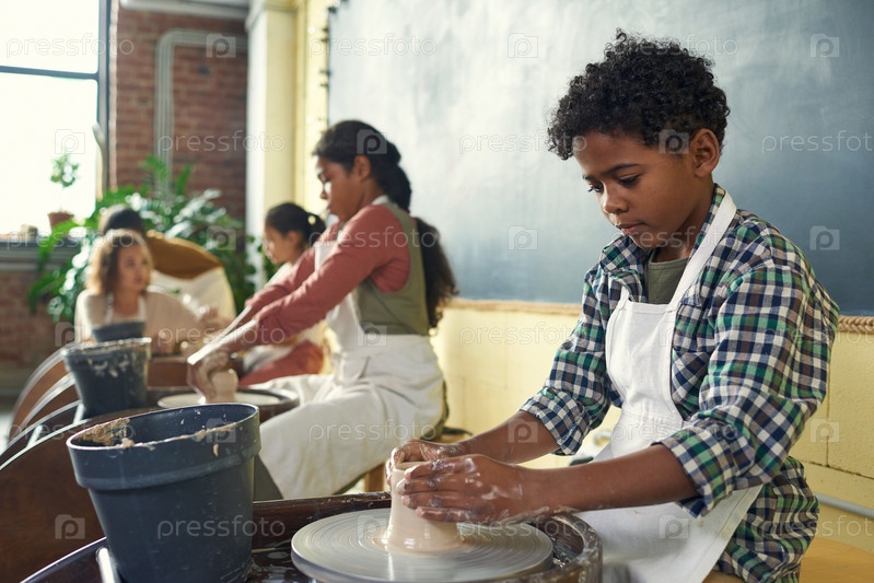 Милый африканский школьник в фартуке скульптурирует глиняную посуду