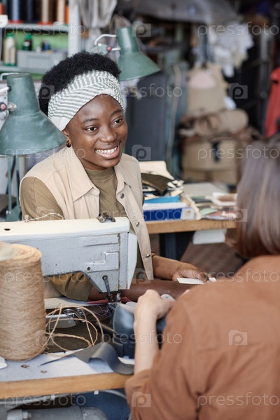 Коллеги, работающие на фабрике одежды