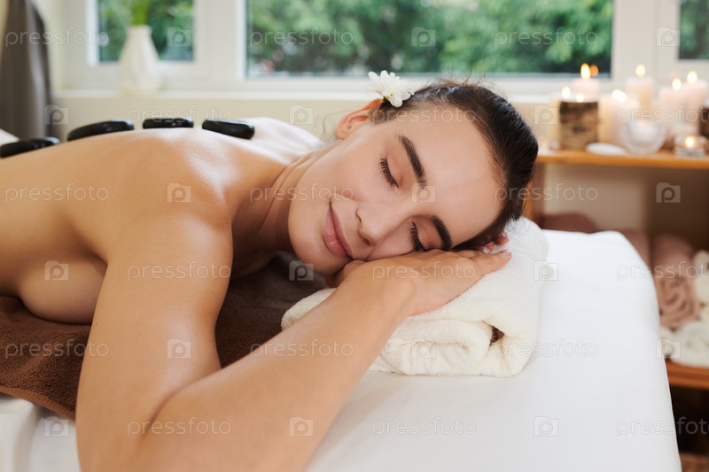 Женщина с горячими камнями на спине