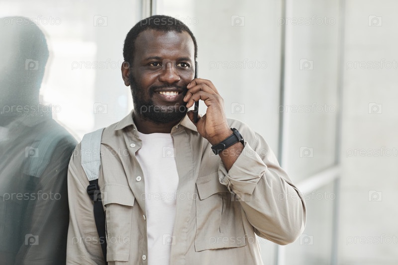 Улыбающийся афроамериканец разговаривает по телефону на улице
