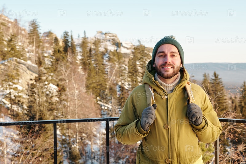 Молодой веселый мужской путешественник с рюкзаком, наслаждающийся зимней поездкой