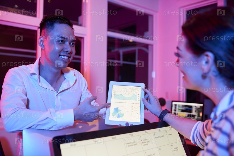 Улыбающиеся предприниматели обсуждают диаграмму