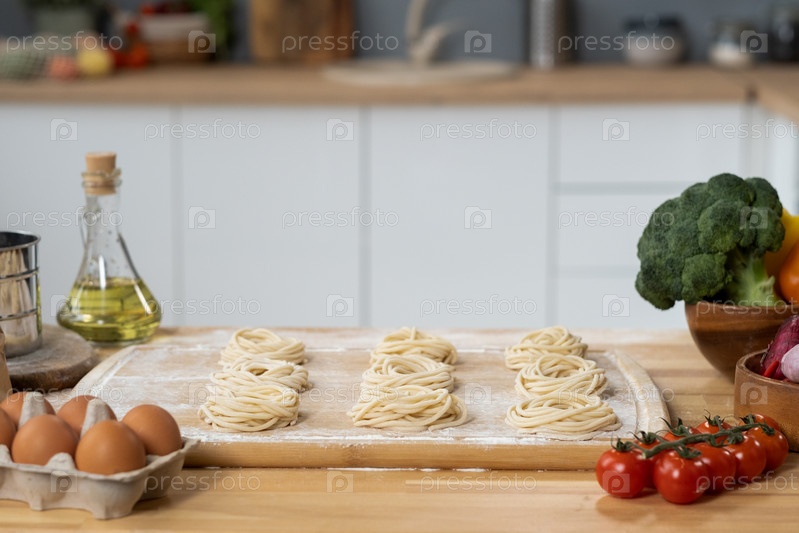 Свернутые вареные спагетти на деревянной доске, окруженные свежими овощами
