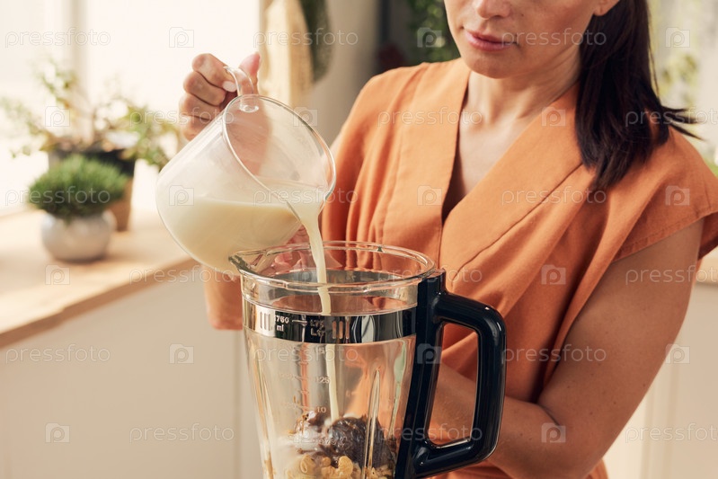Молодая женщина в повседневной одежде наливает молоко в электрический блендер