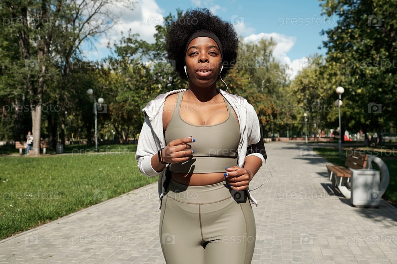 Молодая спортсменка с наушниками бегает в парке