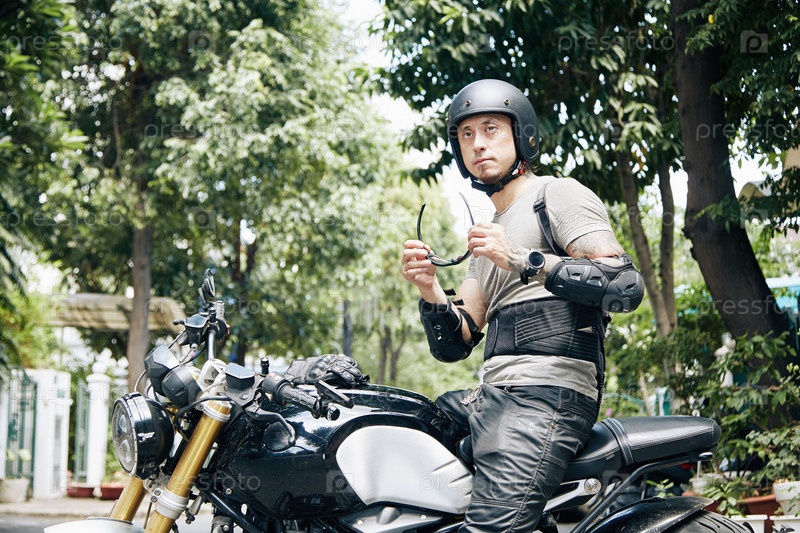 Серьезный мужчина на мотоцикле