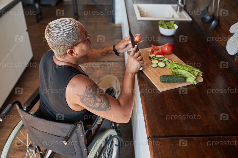 Женщина в инвалидном кресле готовит современную еду