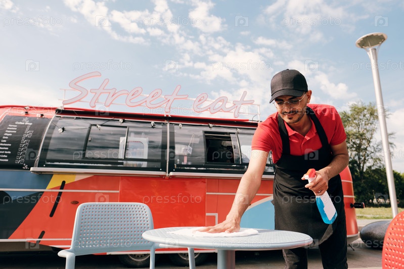 Молодой человек в форме распыляет дезинфицирующее средство на пластиковый стол