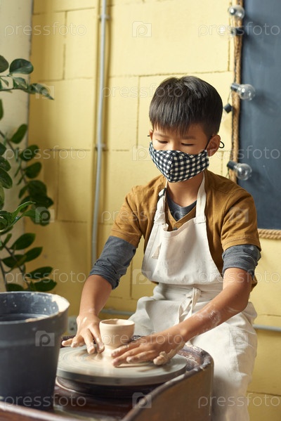 Азиатский школьник в защитной маске скульптурует глиняный горшок