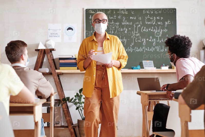 Учитель преподает ученикам в школе во время пандемии