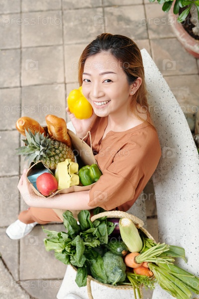 Молодая женщина с пакетом продуктов