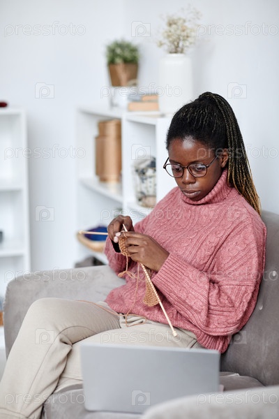 Женщина смотрит видео вязания дома