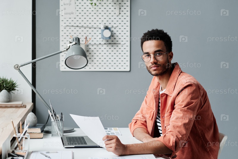 Портрет серьезного уверенного молодого менеджера офиса смешанной расы в очках, сидящего с документом в современном офисе